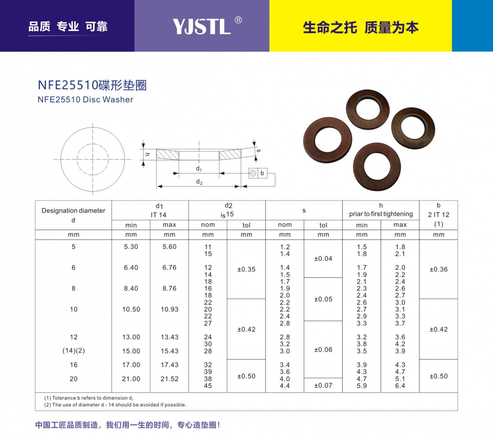 制造執(zhí)行標(biāo)準(zhǔn):符合NFE25510與DIN6796-HS標(biāo)準(zhǔn)。規(guī)格:M5-M20型號,也可提供訂制服務(wù)主要材質(zhì)有S60C,60Si2mn,51crav4及特殊合金材質(zhì),鹽浴硬化,表面處理為磷化黑,機(jī)械鋅,達(dá)克羅涂層等!不提供化學(xué)電鍍處理!多數(shù)情況下標(biāo)準(zhǔn)型碟形彈簧墊圈并不能完全滿足用戶要求,通過計(jì)算與適當(dāng)調(diào)整來獲得理想的訂制功能!