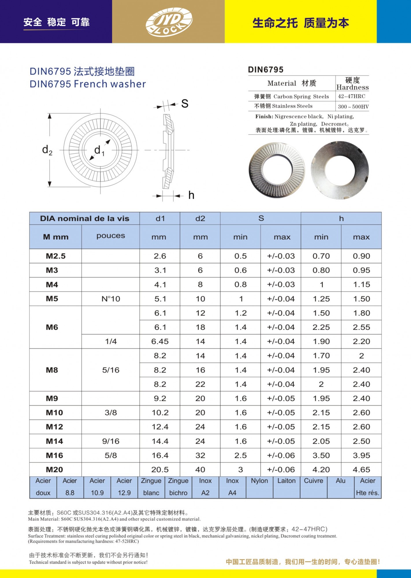 DIN6795是德國標準、法式鎖緊接地墊圈是碟形墊圈改良設計、表面條紋增加了防松作用。背面設計六爪形剌破功能!主要配合螺栓螺釘擰緊時剌破金屬基體表面!